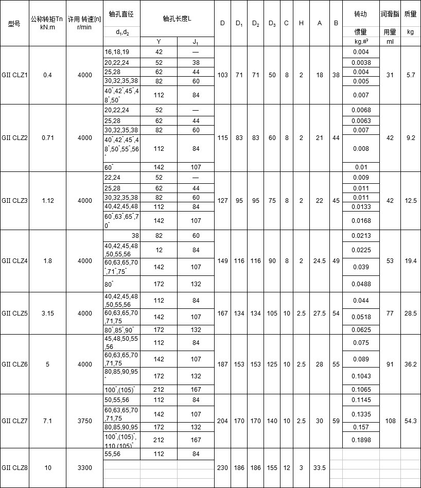 GⅡCLZ型鼓形齒式聯(lián)軸器的參數(shù)和主要尺寸:(JB/T 8854.2-2001) mm